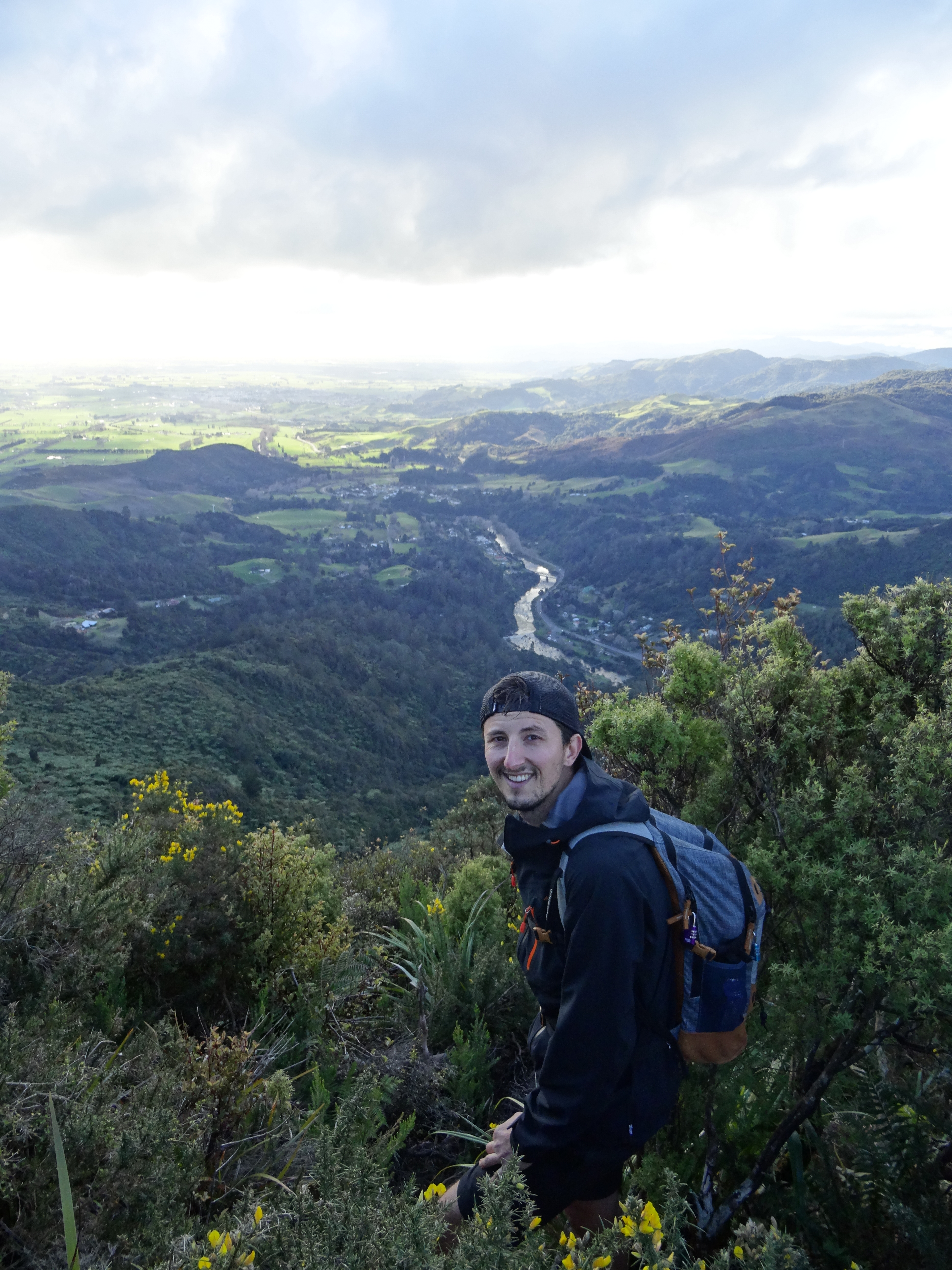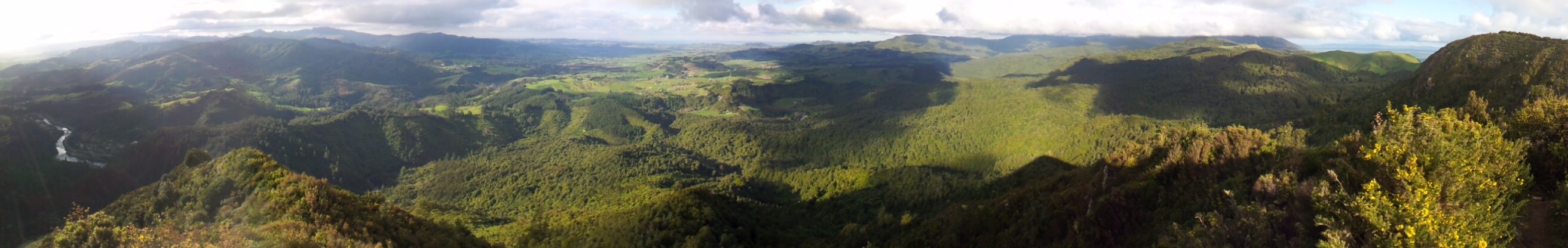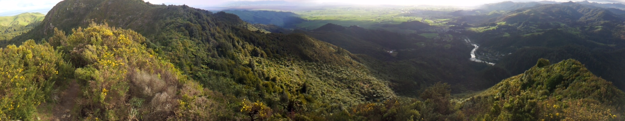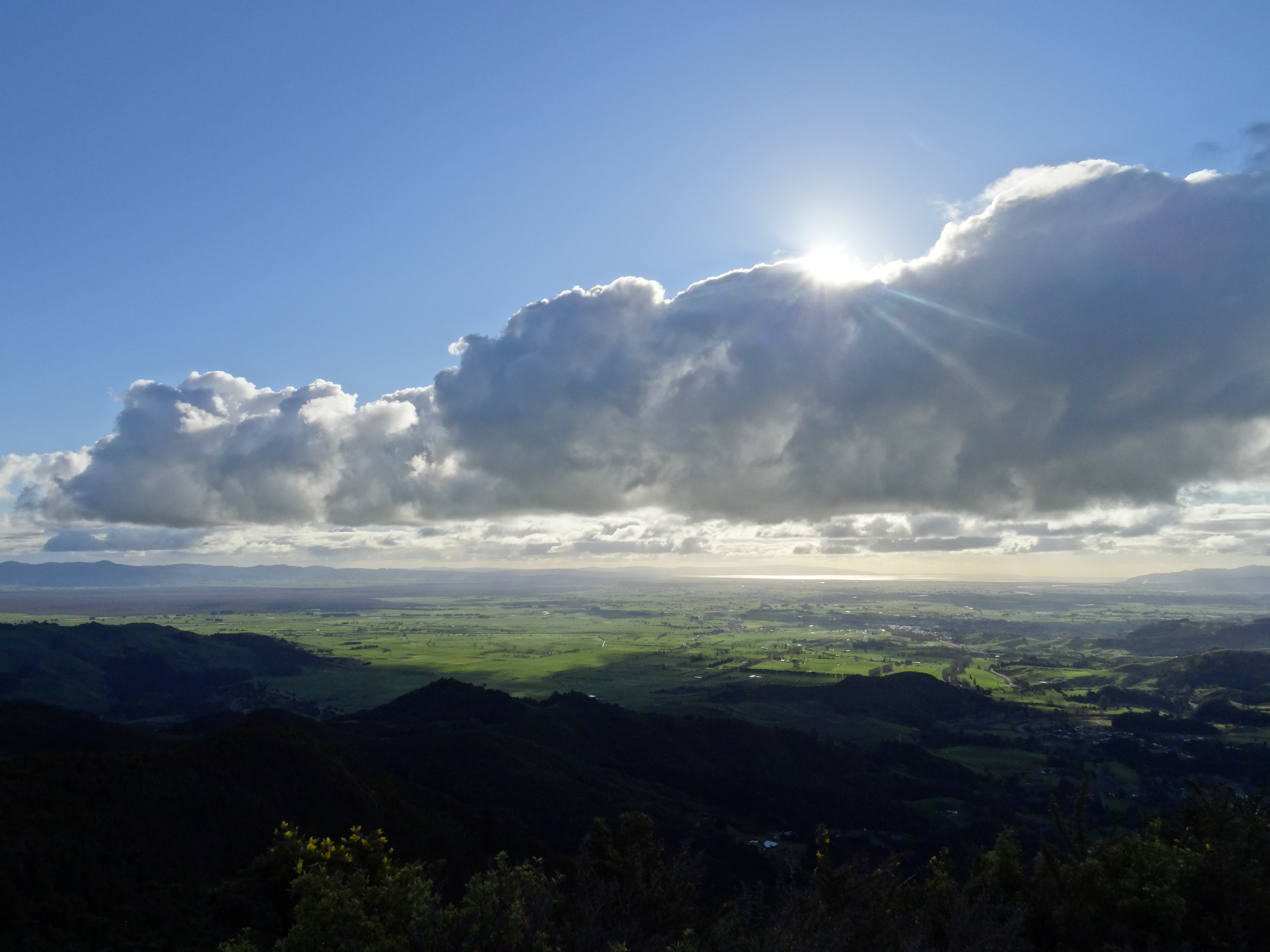Après le tunnel, retour à la case départ. On se décide à monter vers Karangahake Mountain, rando de 4h A/R. On suit notre chemin de rando, à travers une forêt épaisse, des plaines, des pentes et après 2h30 d’effort -et de la boue pleins les godasses- la délivrance. Un paysage de DINGUE. Une vue à 360° sur les gorges, les collines alentours, la Bay of Thames et la Bay of Plenty. C’est magique. Je m’évade un peu et me permets une comparaison avec nos reliefs français. LOL.
