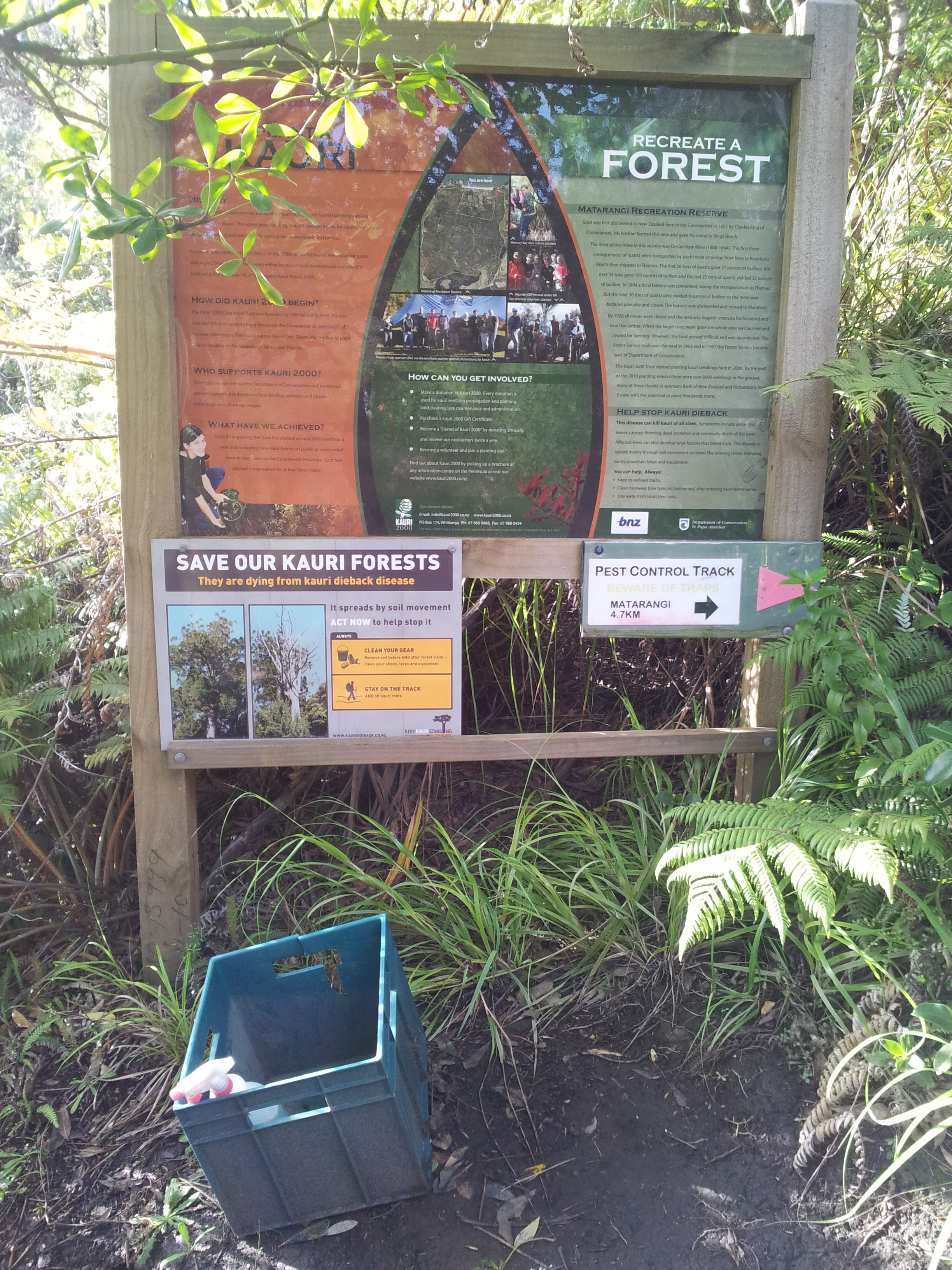 Départ de la rando. Ici, les néo-zélandais se sentent vraiment concernés par la protection de leur environnement, notamment envers les kauris, forêts natives de l’île. Du coup, au début de beaucoup de randos, on retrouve un spray désinfectant, une brosse pour les chaussures, un panneau qui indique qu’il ne faut pas toucher aux arbres et rester sur le sentier. Voilà qui est dit. Une belle preuve d’éco-civisme ! La France, à bon entendeur.