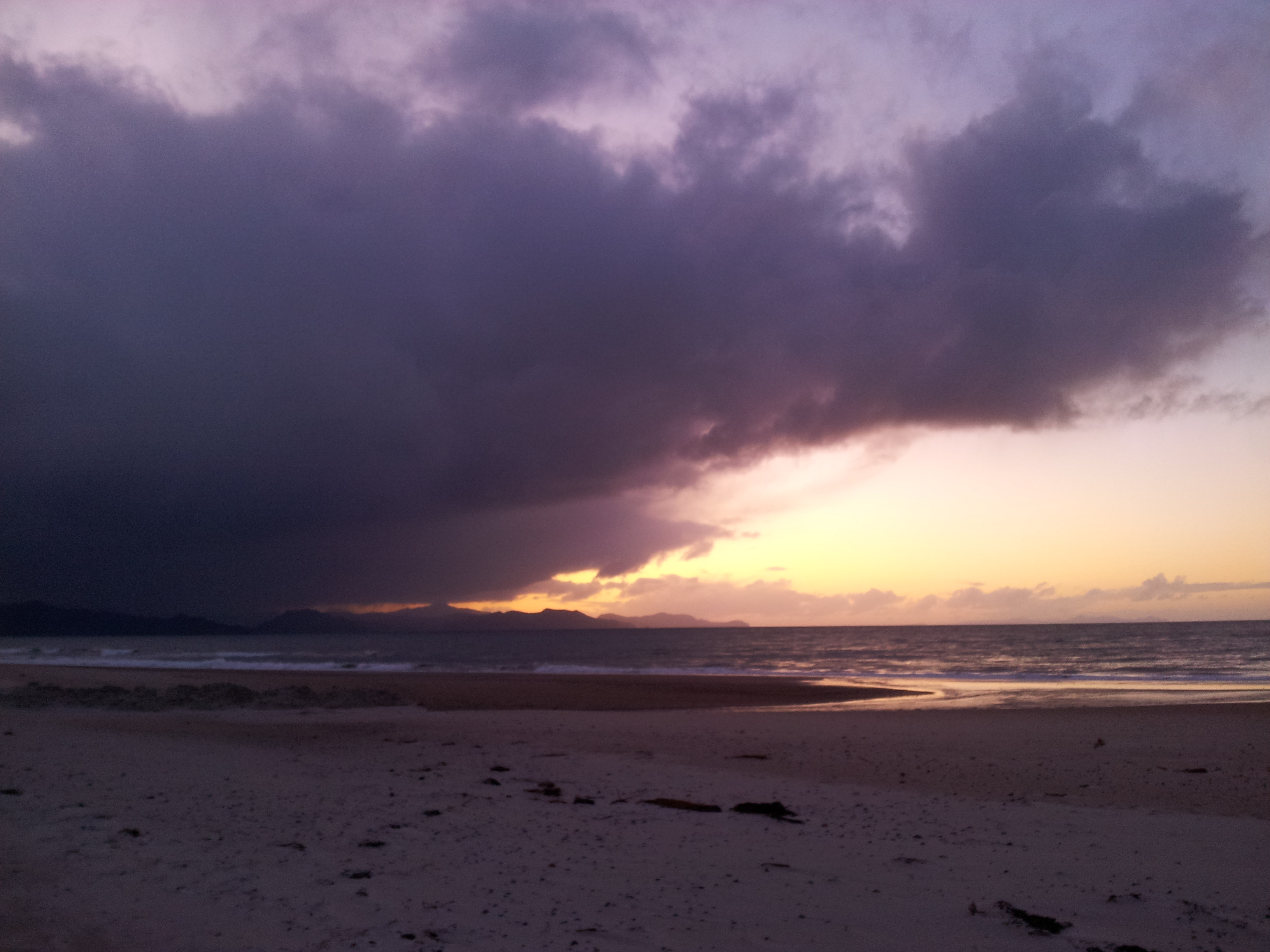 45km/h, vitesse de pointe dans la descente. Oooh yeaaah ! J’arrive pile poil pour le coucher de soleil sur la plage de Kuaotunu…