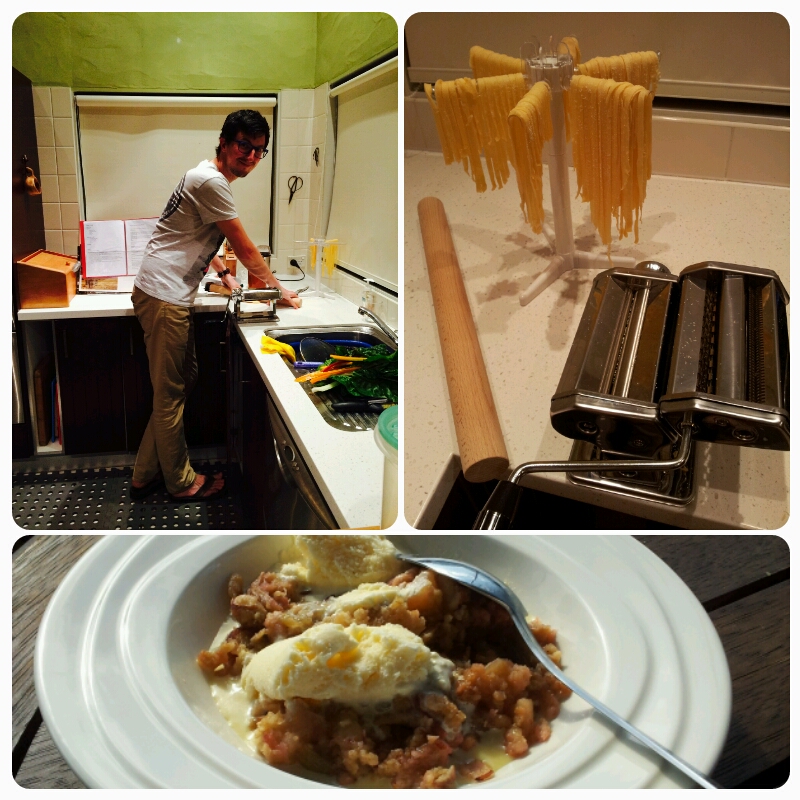 Ce soir, Carol reçoit son premier client AirBnB, Yohan un belge qui bosse et vit sur Melbourne depuis 5 ans. Du coup, repas royal tous ensemble. Beef Stew & Veges, pâtes maison, crumble pommes/rhubarbe/orange + glace vanille maison. Absolutely gorgeous !